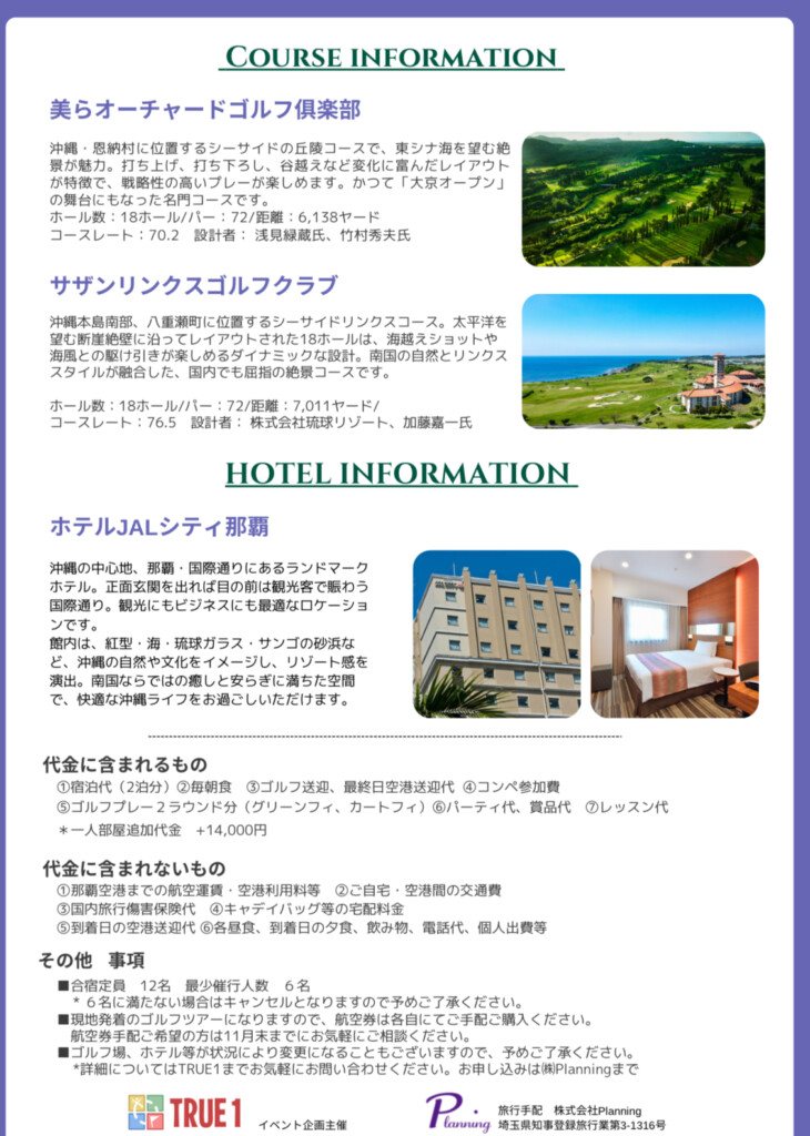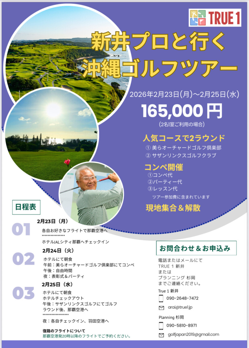 2026年2月23日〜25日にて沖縄ゴルフツアーを開催致します。美らオーチャードGCでの親睦コンペ&パーティに人気コースのサザンリンクスGCでのラウンド&レッスン会を行います。また宿泊は沖縄の中心地、那覇の国際通りに面しているJALシティホテルでの宿泊となります。寒い日本を離れ暖かい南国の地で新井プロと一緒にゴルフを楽しみましょう。
